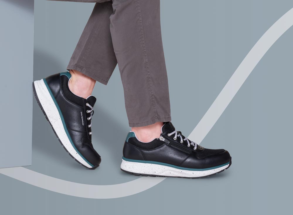 Für den comfort verwöhnten Herrn ist das Modell DYNAMO ZIP M BLACK III von JOYA mit einem hohen Tragecomfort genau das richtige. Das Obermaterial ist aus einer hochwertigen Leder Materialmix. Auch die textile Innenverarbeitung überzeugt durch ihre angenehm weiche Beschaffenheit. Die patentierte Ortholite Support Einlegesohle ist sehr leicht und stark atmungsaktiv. Sie besteht aus einem PU-Schaum mit EVA-Verstärkung im Fersen- und Mittelfußbereich für zusätzliche Stabilität.Natürlich ist die Sohle herausnehm- und auswechselbar. Der Schnitt ist für breitere Füße (Weite H) geeignet. Der Absatz ist durchgehend flach ,die Sohlenkategorie emotion steht für Freude am Stehen und Gehen.Die weich-elastische Joya Sohle dämpft jeden Stoß ab und unterstützt dadurch effektiv die Entlastung von Rücken und Gelenken. Das Ergebnis: ein einzigartiger Gehkomfort. Ideal für Menschen, die sich und ihre Füße mit einem einzigartig weichen Geh-Gefühl verwöhnen wollen.Kennzeichen der emotion-Active Technologie ist die besonders breite Sohle im Fersen- und Vorfußbereich um Weichheit mit Stabilität optimal zu kombinieren. Wichtig ist diese Stabilität vor allem im Arbeits- und Outdoorbereich.Besonders geeignet für den sportiven Lifestyle und Anwendungsbereiche in Beruf und Freizeit wo die körperliche Entlastung beim Gehen und Stehen wichtig ist. Ein klassischer Schnürverschluss rundet das Design ab und gibt Ihnen die Möglichkeit, die Passform des Schuhs zu optimieren. Durch die runde Schuhspitze wirkt der Schuh dezent am Fuß und bietet genügend Platz für die Fußzehen. Die Schuhgröße fällt regulär aus.